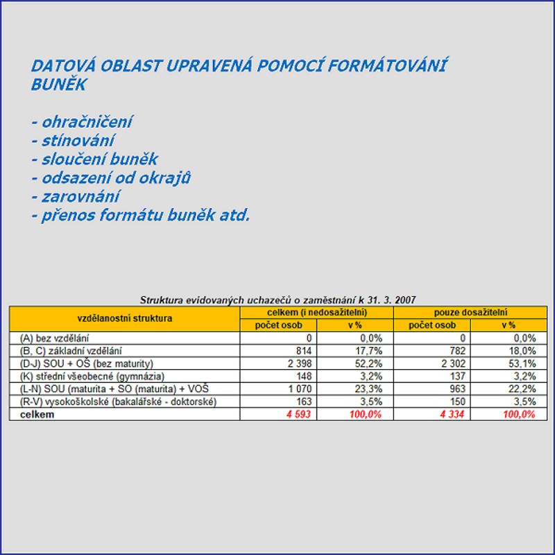 1. Základy práce s datyKapitola Základy práce s daty je zaměřena na zvládnutí základních postupů pro práci s daty v tabulce, např. různé způsoby vkládání dat do buněk, tři způsoby označení bloku dat, nastavení typů dat, formátování buněk, efektivní vložení sloupců do datové oblasti.
